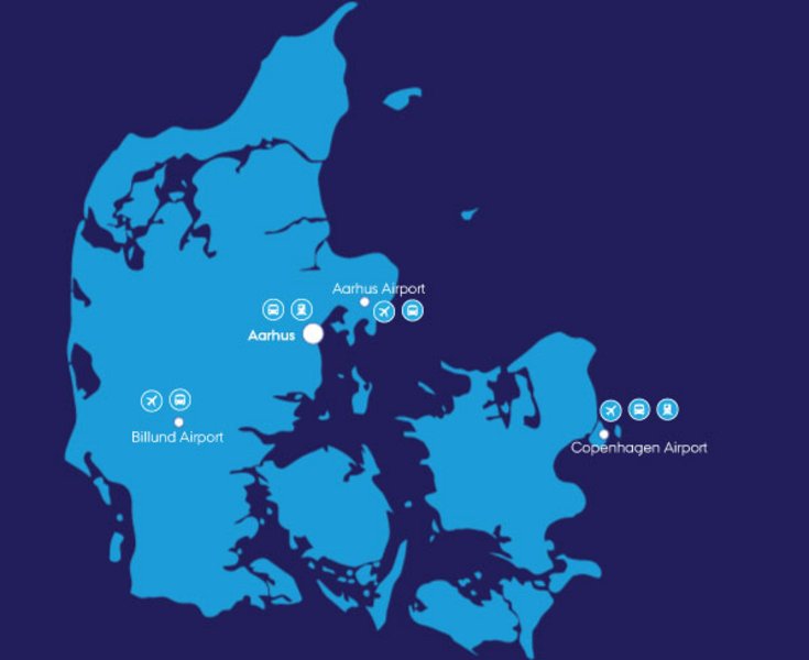 Billund Airport is located 100 kilometres south of Aarhus and has direct international flight connections to many European cities. The bus ride from Billund to Aarhus takes 1.5 hours, and costs approximately DKK 140 (one-way/cash only). Find the departure that suits you the best right here. Taxi and limousine services are also available.