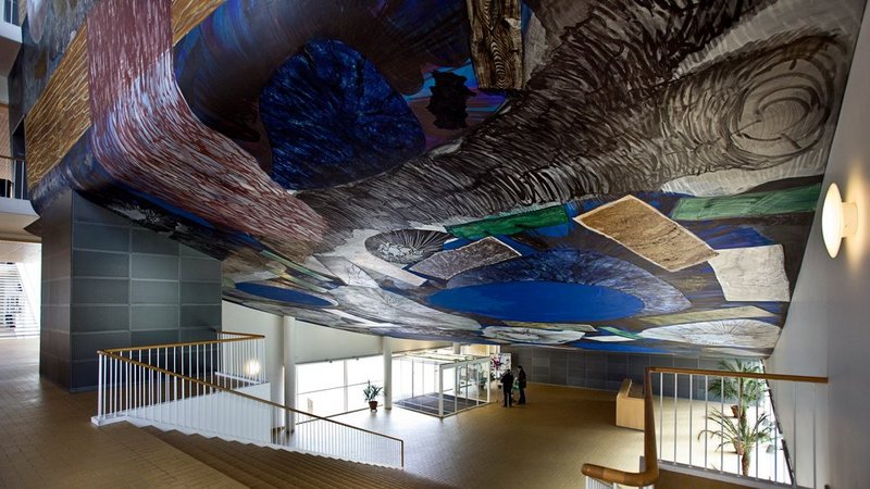 Inside, Danish artist Per Kirkeby created a large-scale painting on the walls and ceiling in 2001. Covering approx. 500 m2, the painting can be seen from the foyer and each of the three floors.